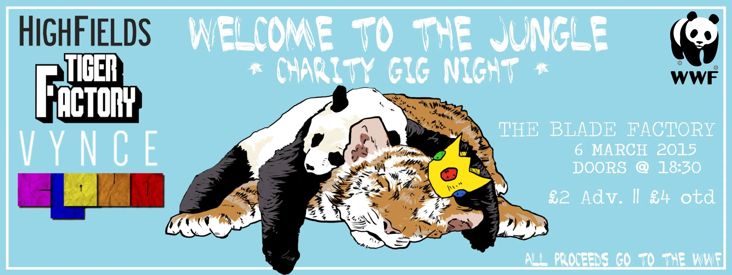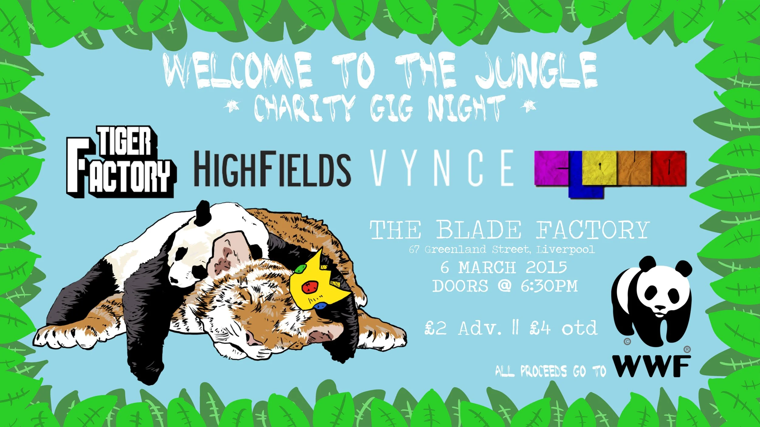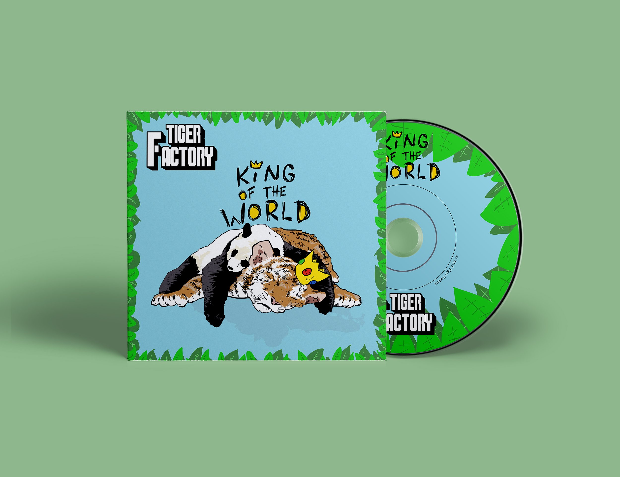 In 2015 Tiger Factory had finished recording their newest single, “King of the World”, and wanted to put on a special concert event to celebrate. The show would be a performance in their local city of Liverpool with proceeds benefitting the World Wildlife Foundation. Having previously leaned into the jungle aesthetic with them before I decided to do it again, but this time using a more illustrated approach. Whatever graphics I designed would have to work for social media, the physical ticket stubs for the event, and the album packaging for the single itself. Having an illustrated border of leaves allowed me to keep things consistent, and creating a tiger character to go along with the WWF’s panda seemed like a perfect fit.