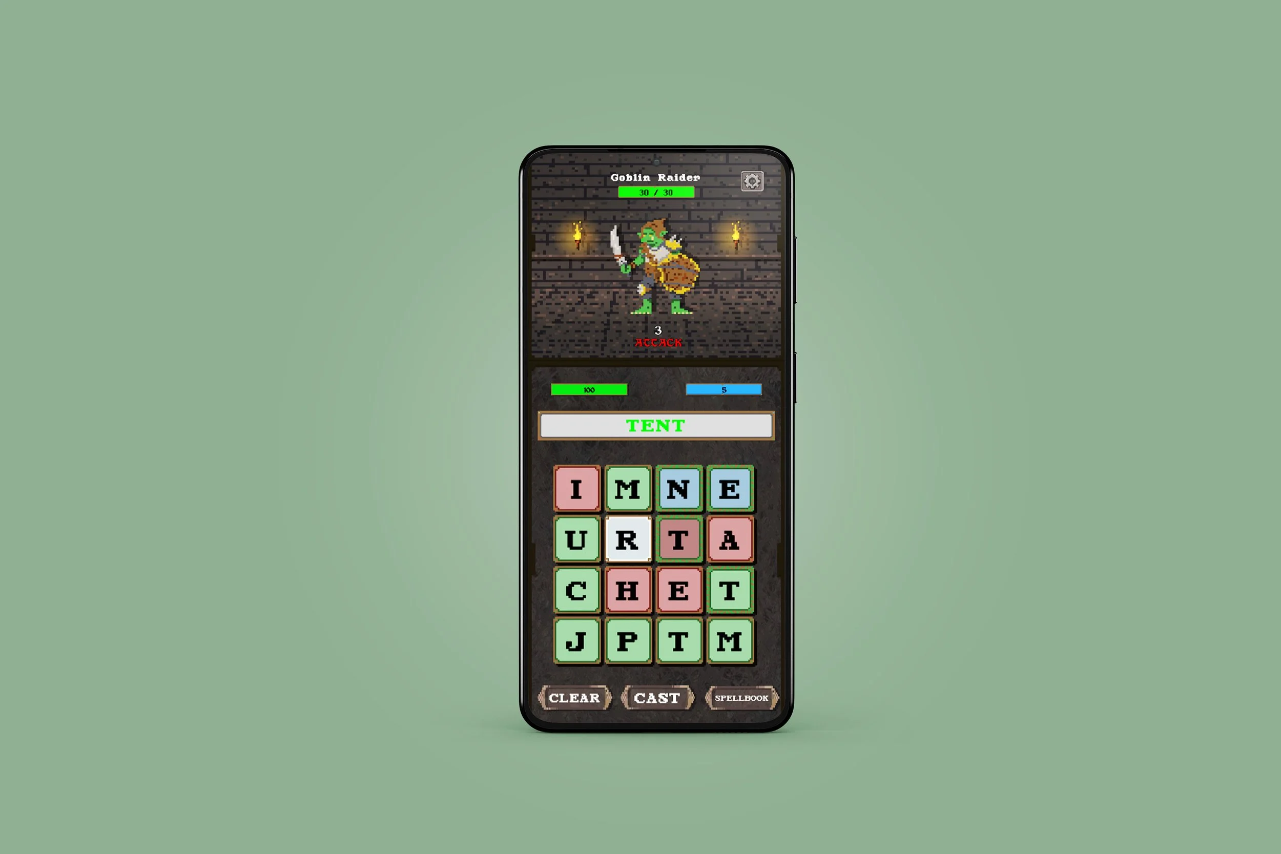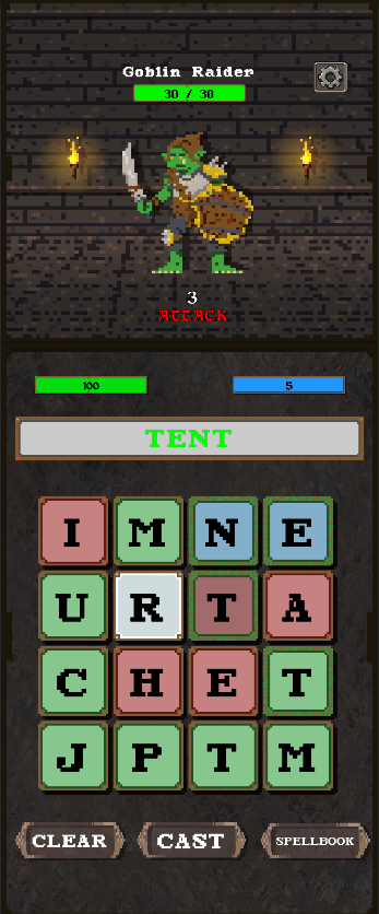 A game in which the player types out words, and eventually the names of spells, to do damage and other effects to various dungeon enemies. Each letter’s tile is tuned to an elemental type to allow players to create combos and more interesting attacks.